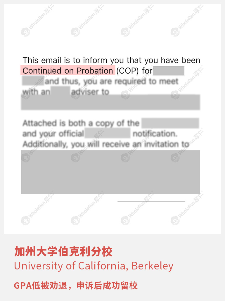 X同学因为家庭原因导致心理抑郁,没有心思读书,结果期末时两门课F,严重影响了GPA,被学校开除。专家老师在了解学生的情况后,指导学生准备申诉信,诚恳解释自己成绩不理想的原因,证明自己有能力继续完成学业,最终学校通过了X同学的申诉,成功留校。