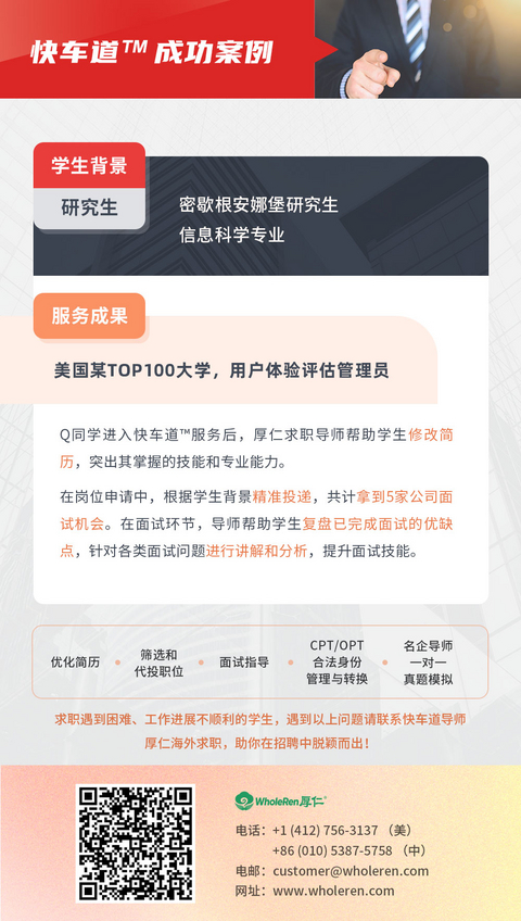 Q同学进入快车道™服务后,厚仁求职导师帮助学生修改简历,突出其掌握的技能和专业能力。在岗位申请中,根据学生背景精准投递,共计拿到5家公司面试机会。在面试环节,导师帮助学生复盘已完成面试的优缺点,针对各类面试问题进行讲解和分析,提升面试技能。