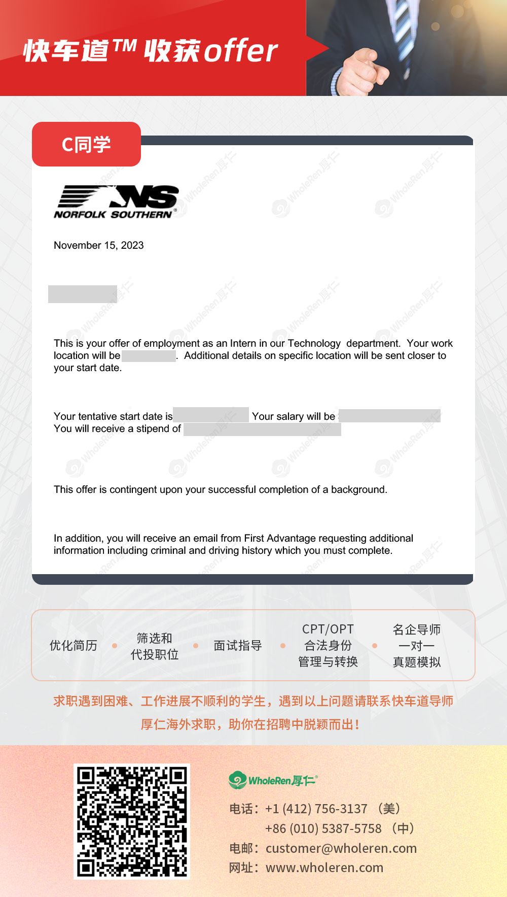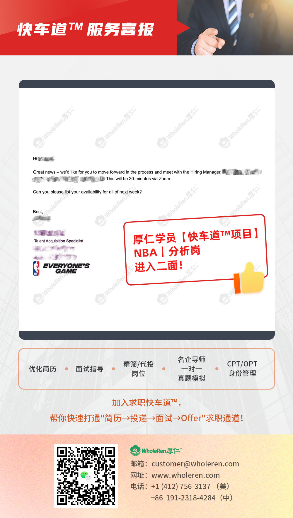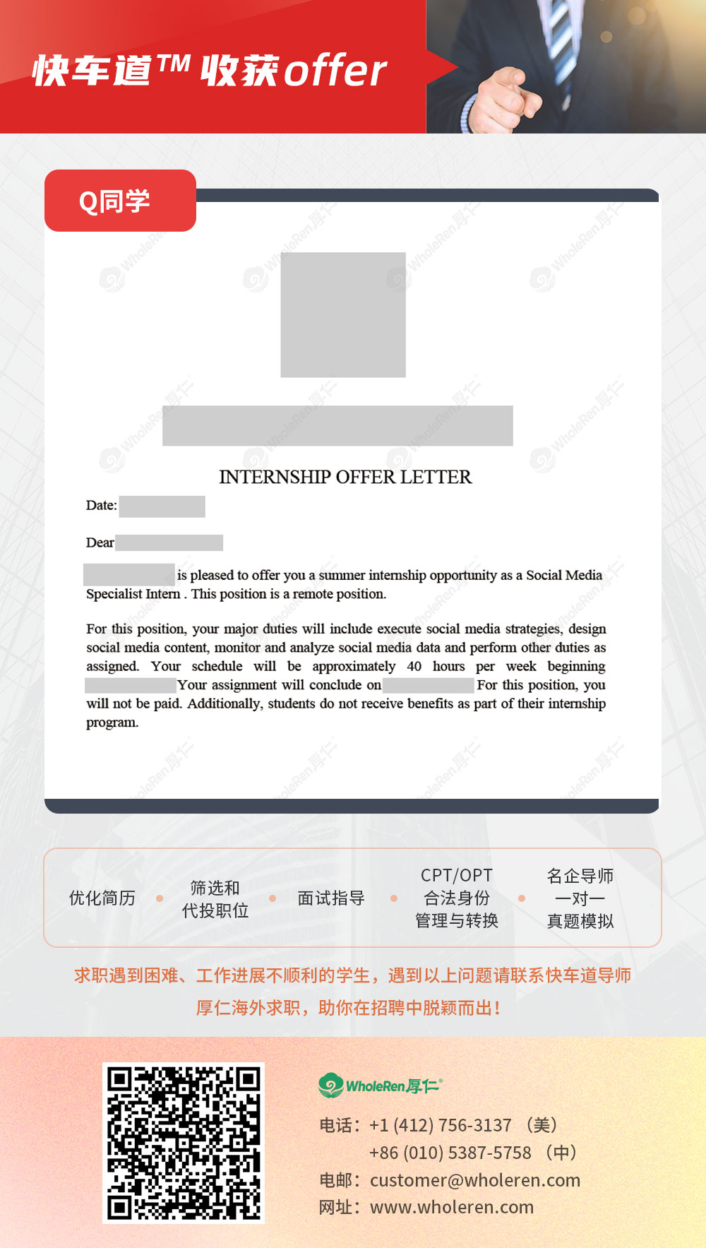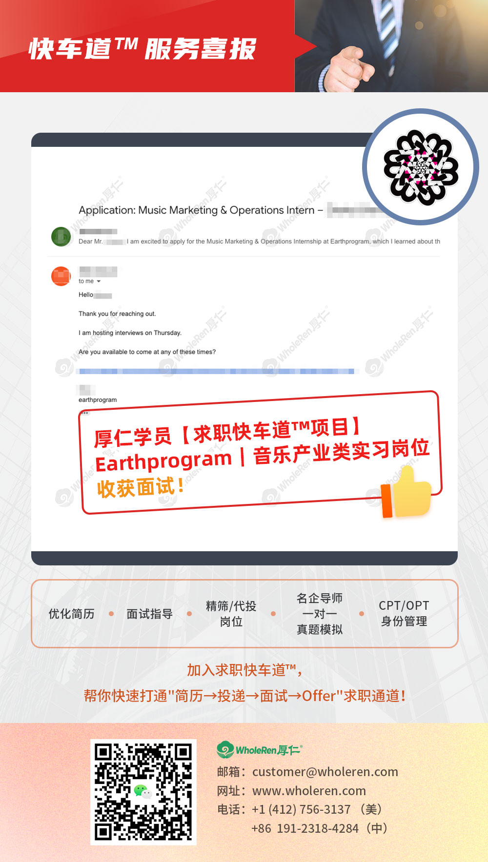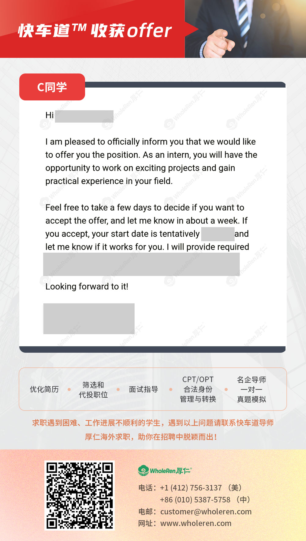 W同学在秋招的时候自己投递了很多岗位,但是迟迟都没有任何回应。在秋招快结束前W同学找到厚仁,选择了快车道™项目!厚仁求职导师在短时间内快速带领学生完成简历打磨,随后立刻开展了精准投递工作,在感恩节前夕收到公司面试邀请!厚仁导师对W同学进行多次面试辅导,经历过三轮面试后,终于收到公司的offer!