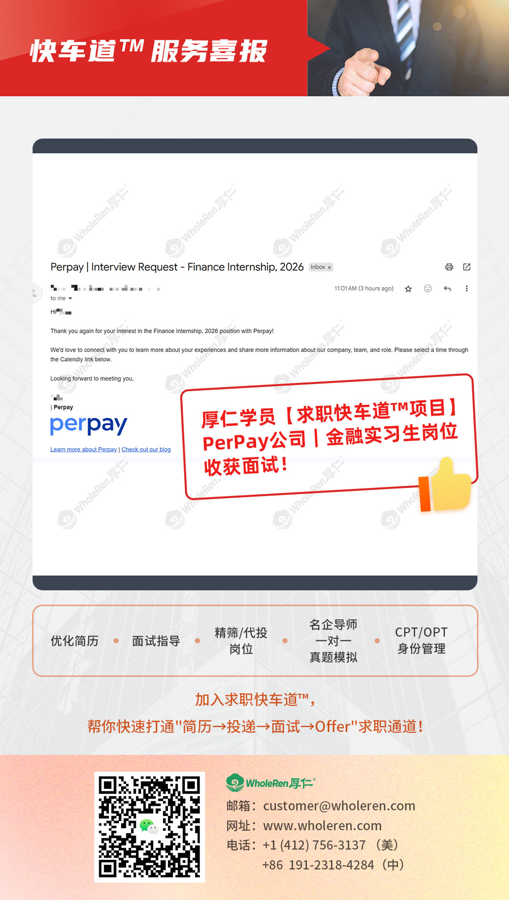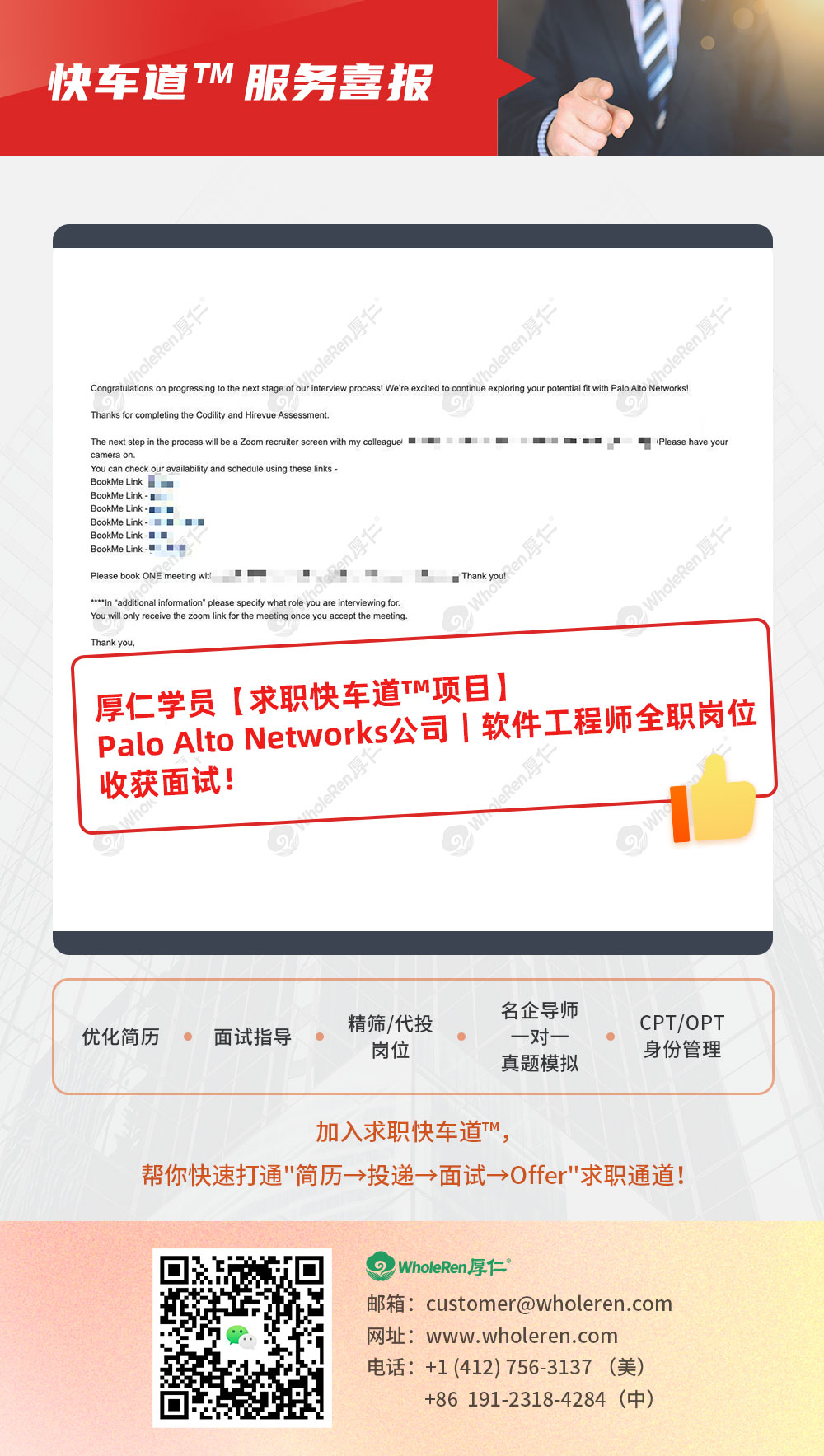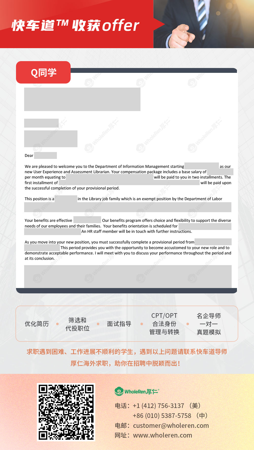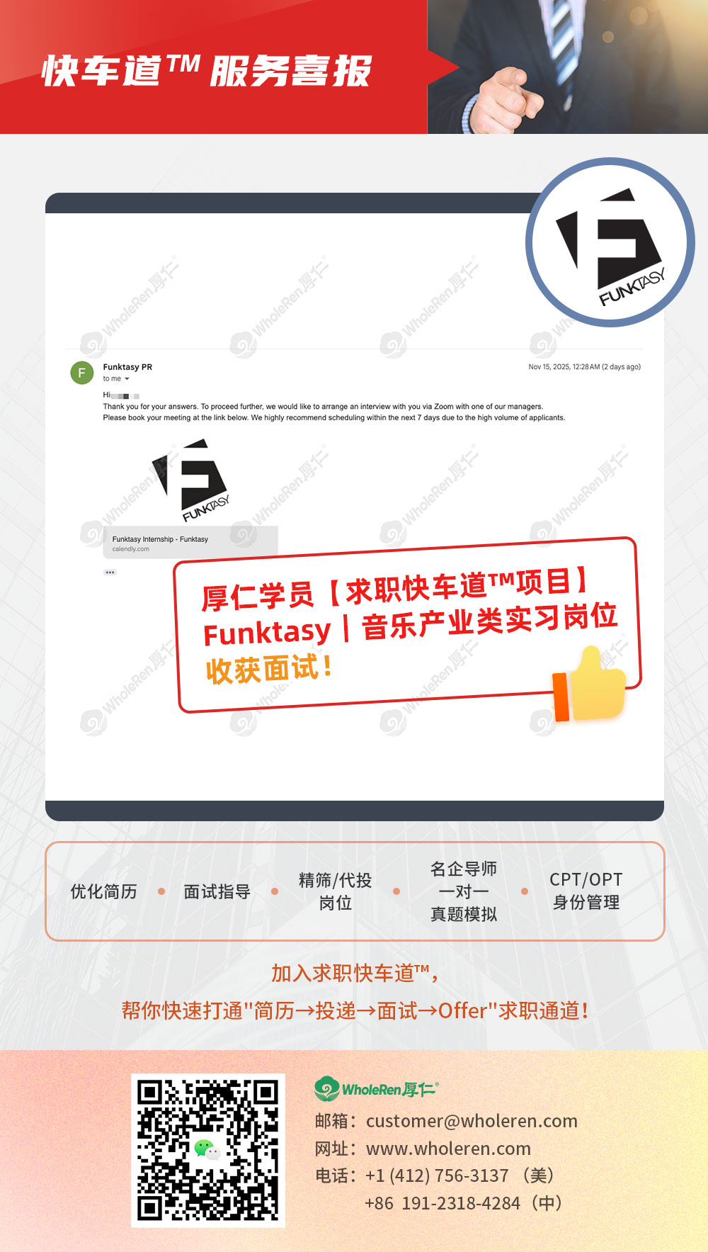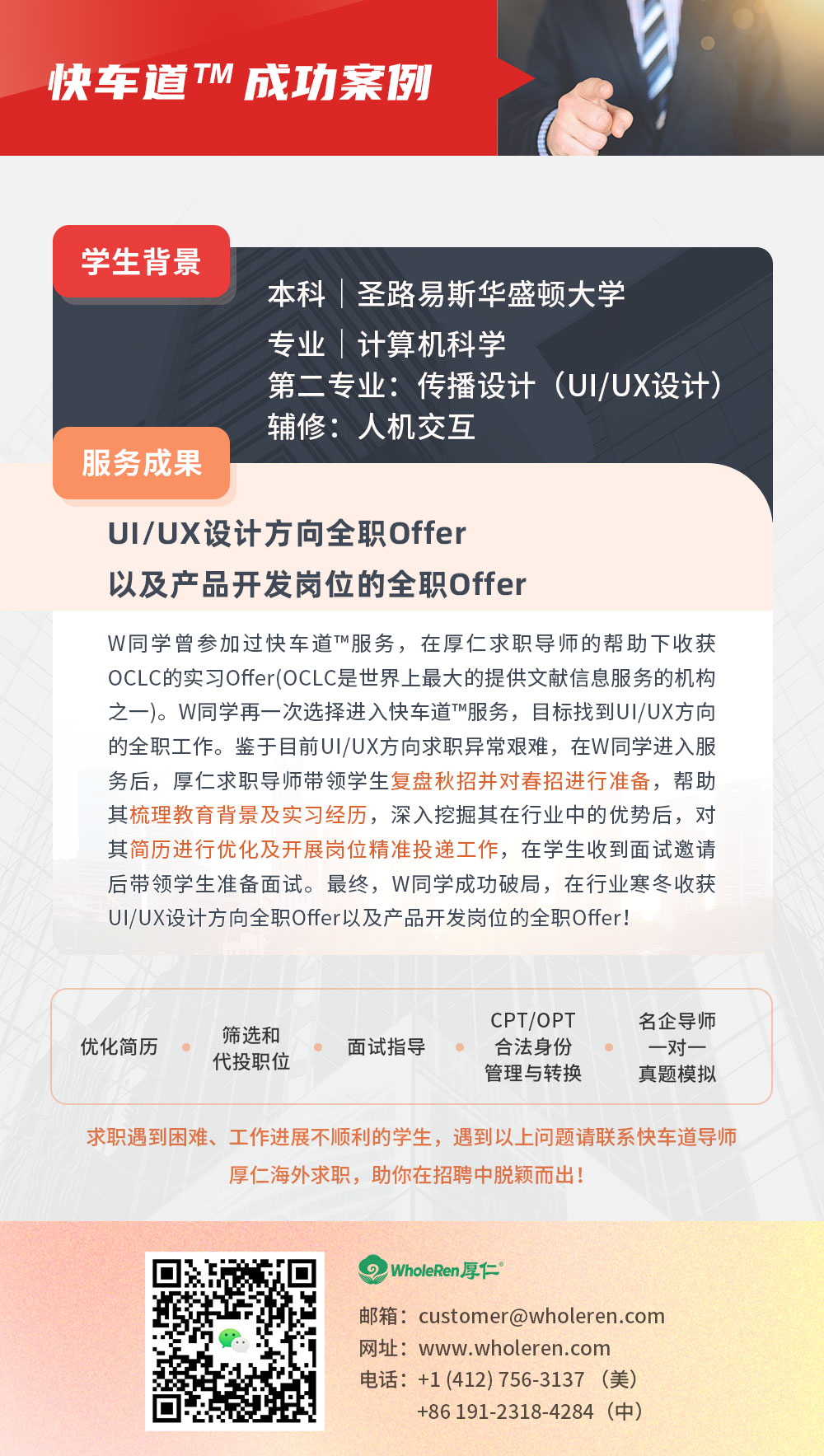 W同学在秋招的时候自己投递了很多岗位,但是迟迟都没有任何回应。在秋招快结束前W同学找到厚仁,选择了快车道™项目!厚仁求职导师在短时间内快速带领学生完成简历打磨,随后立刻开展了精准投递工作,在感恩节前夕收到公司面试邀请!厚仁导师对W同学进行多次面试辅导,经历过三轮面试后,终于收到公司的offer!