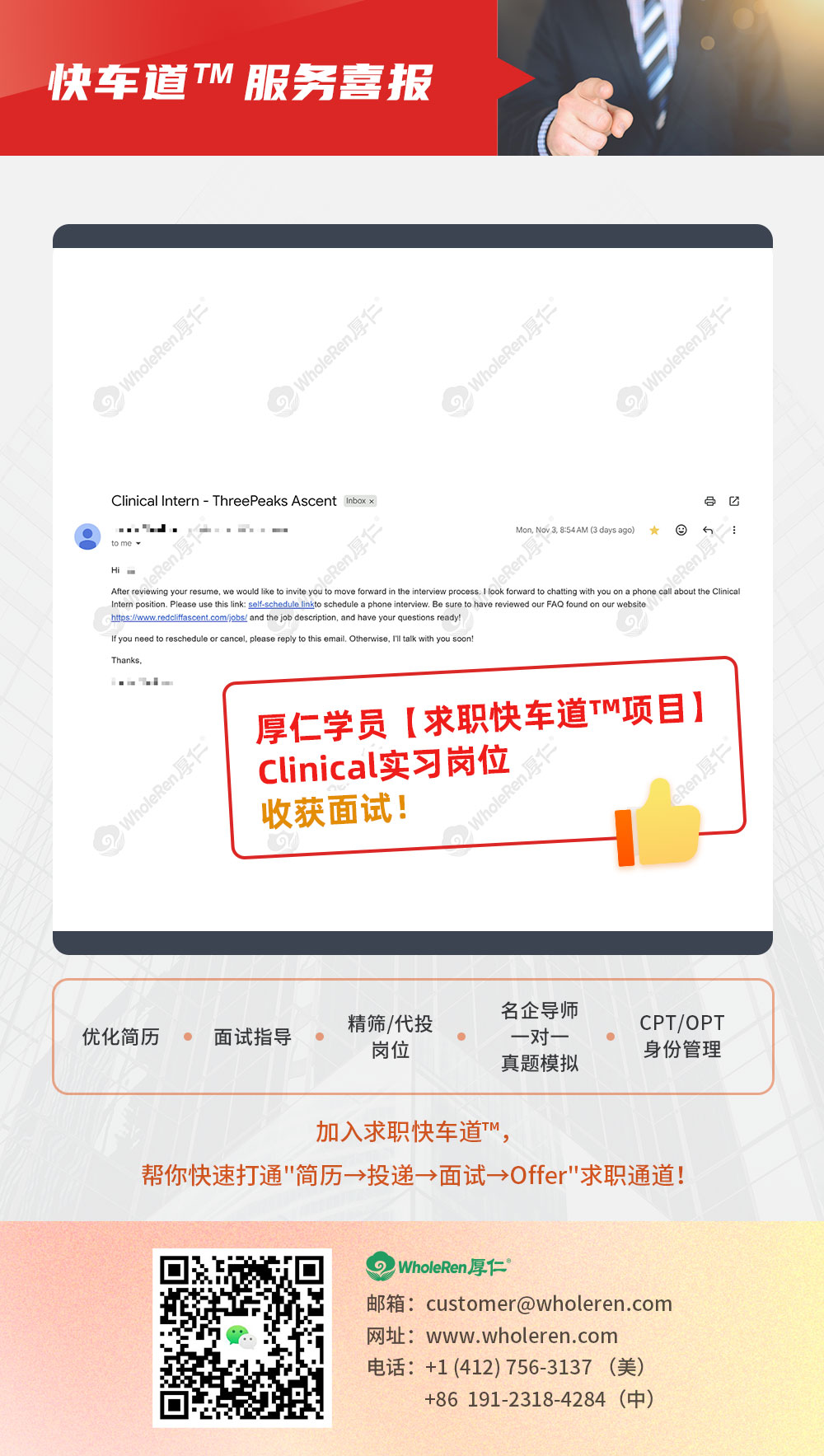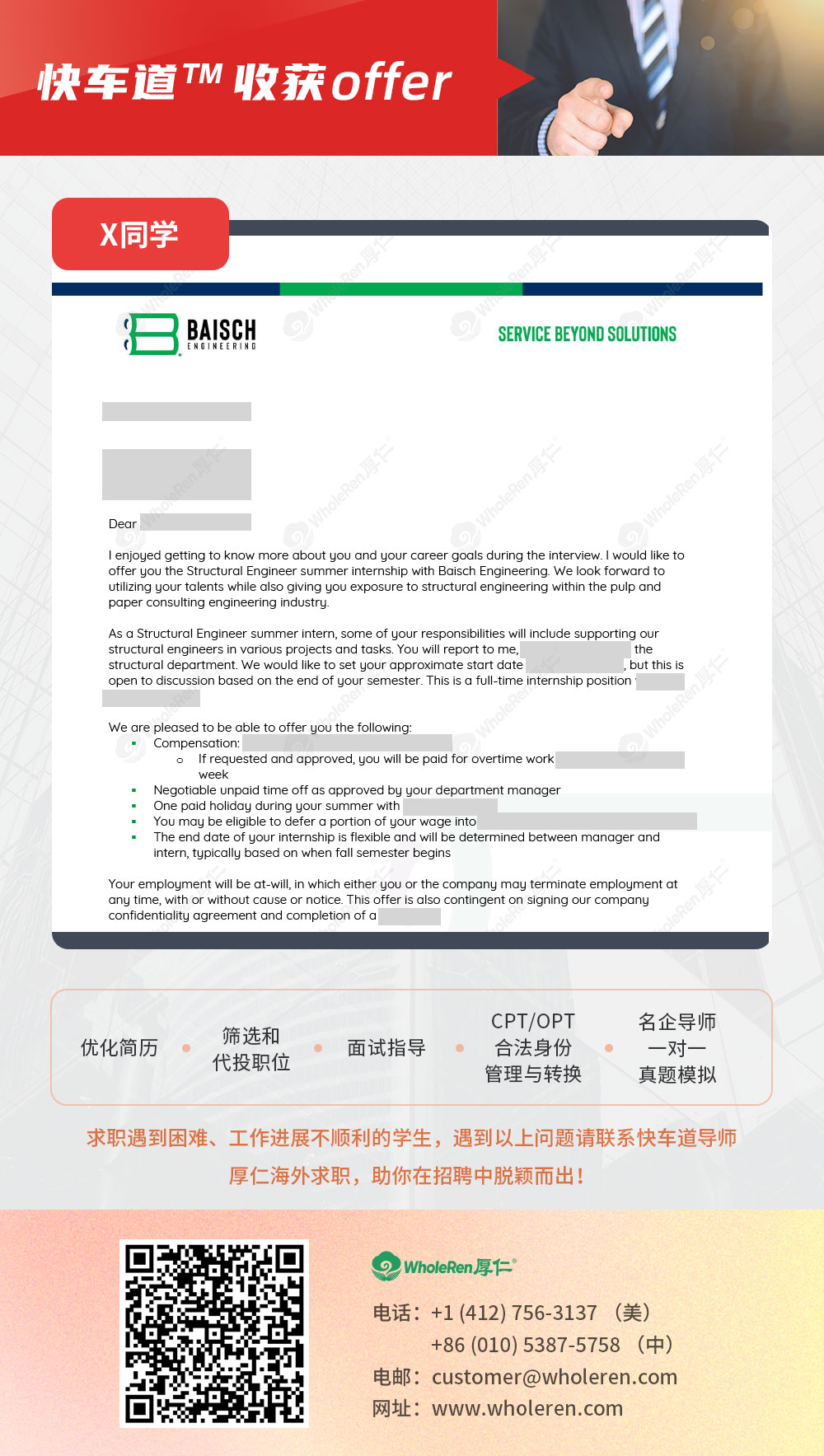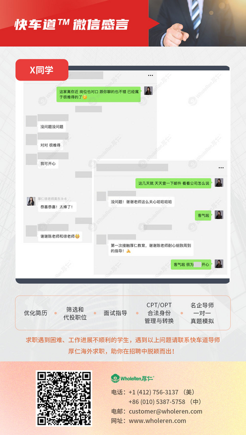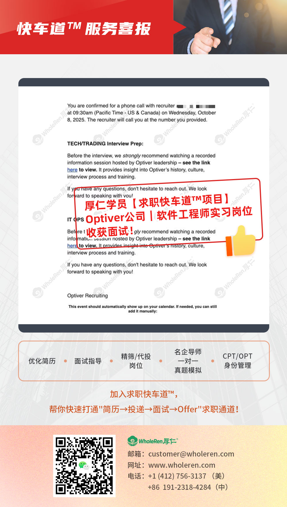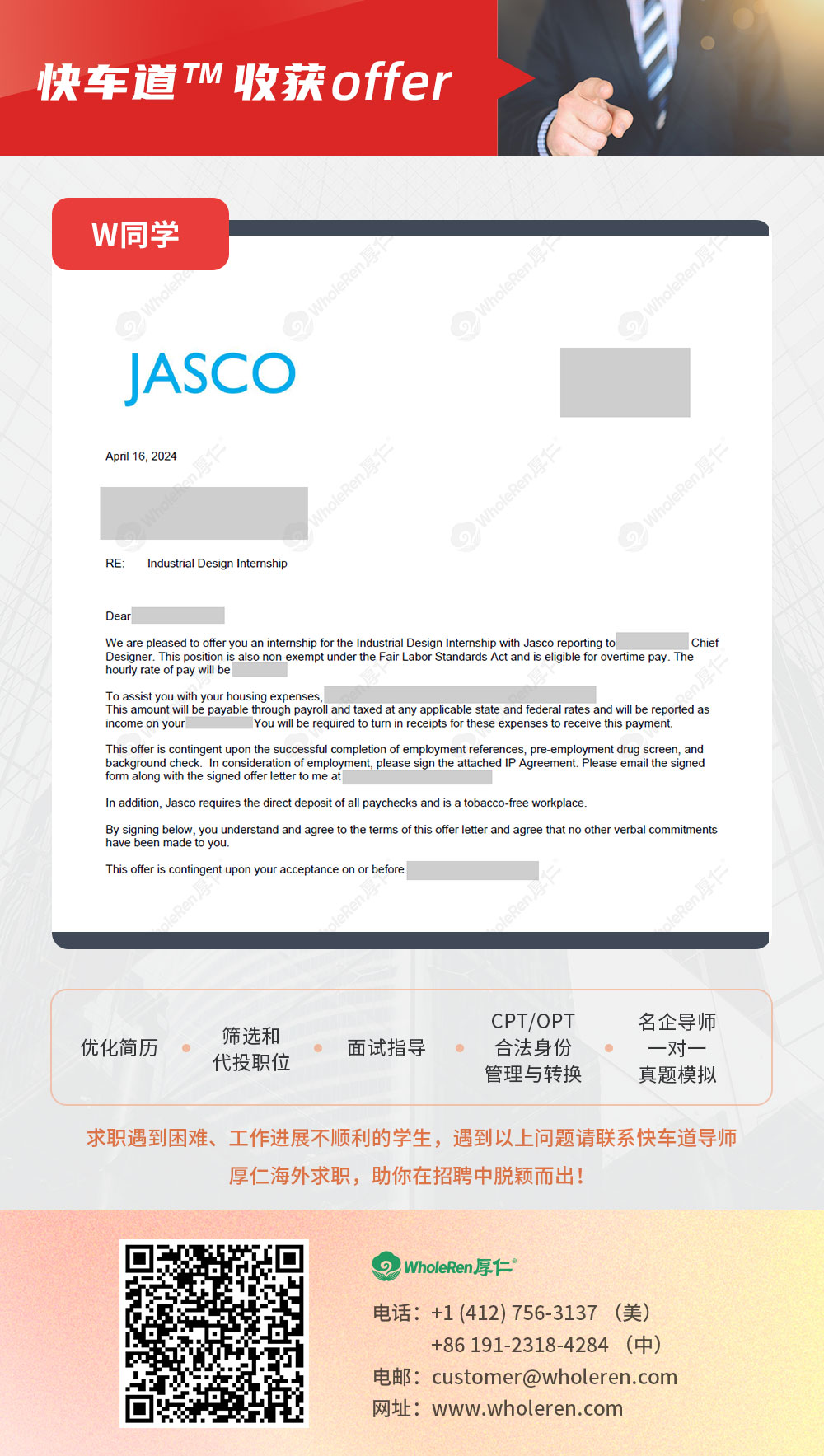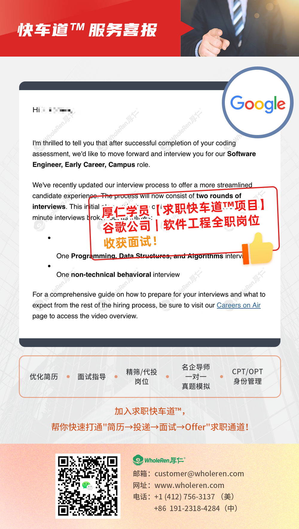 W同学在秋招的时候自己投递了很多岗位,但是迟迟都没有任何回应。在秋招快结束前W同学找到厚仁,选择了快车道™项目!厚仁求职导师在短时间内快速带领学生完成简历打磨,随后立刻开展了精准投递工作,在感恩节前夕收到公司面试邀请!厚仁导师对W同学进行多次面试辅导,经历过三轮面试后,终于收到公司的offer!