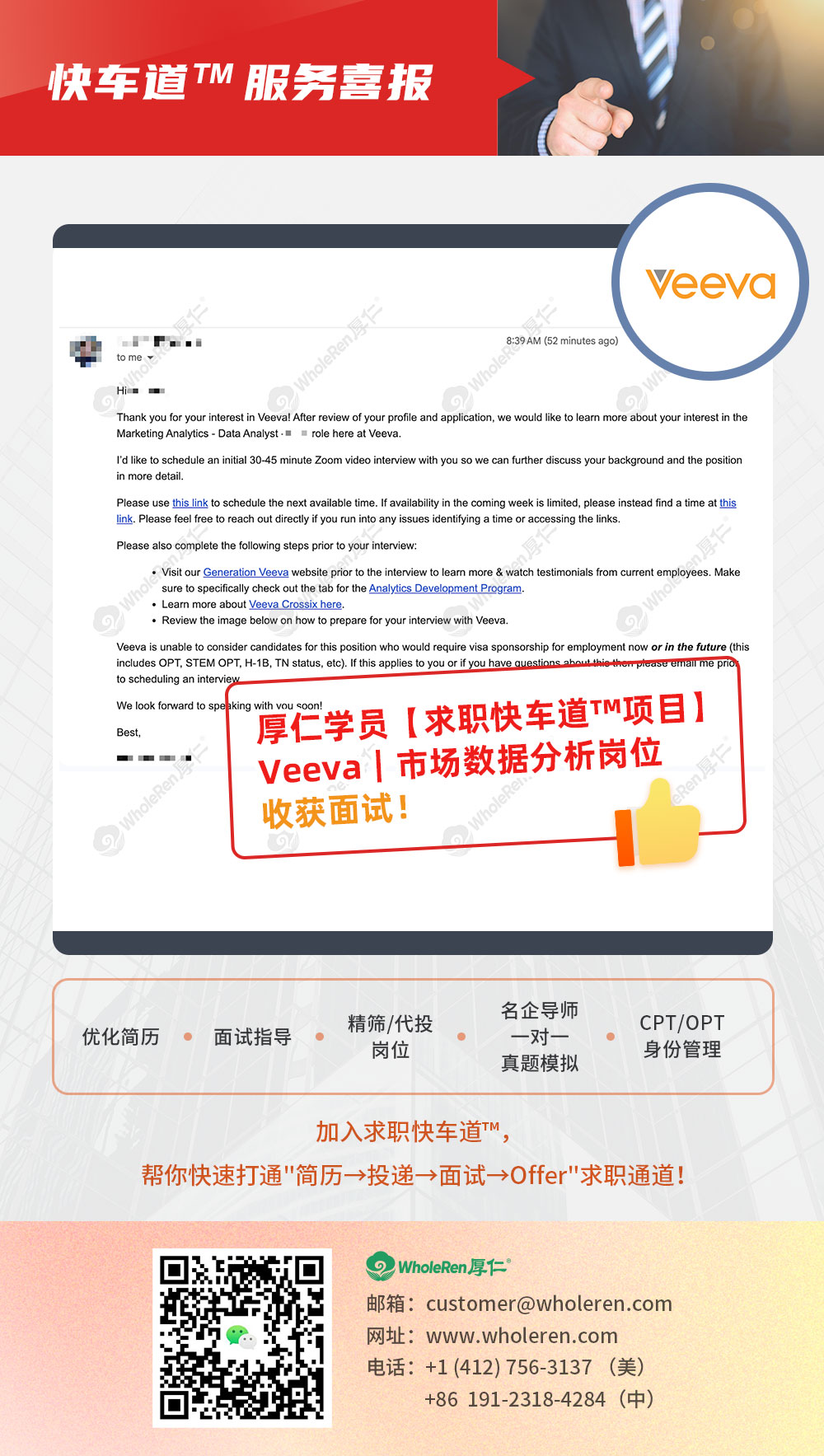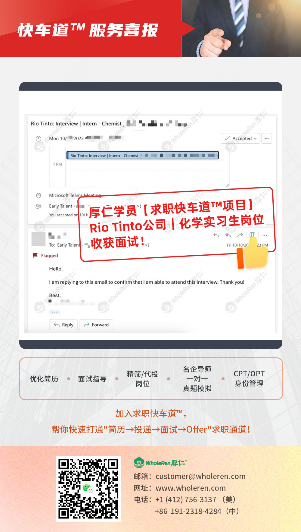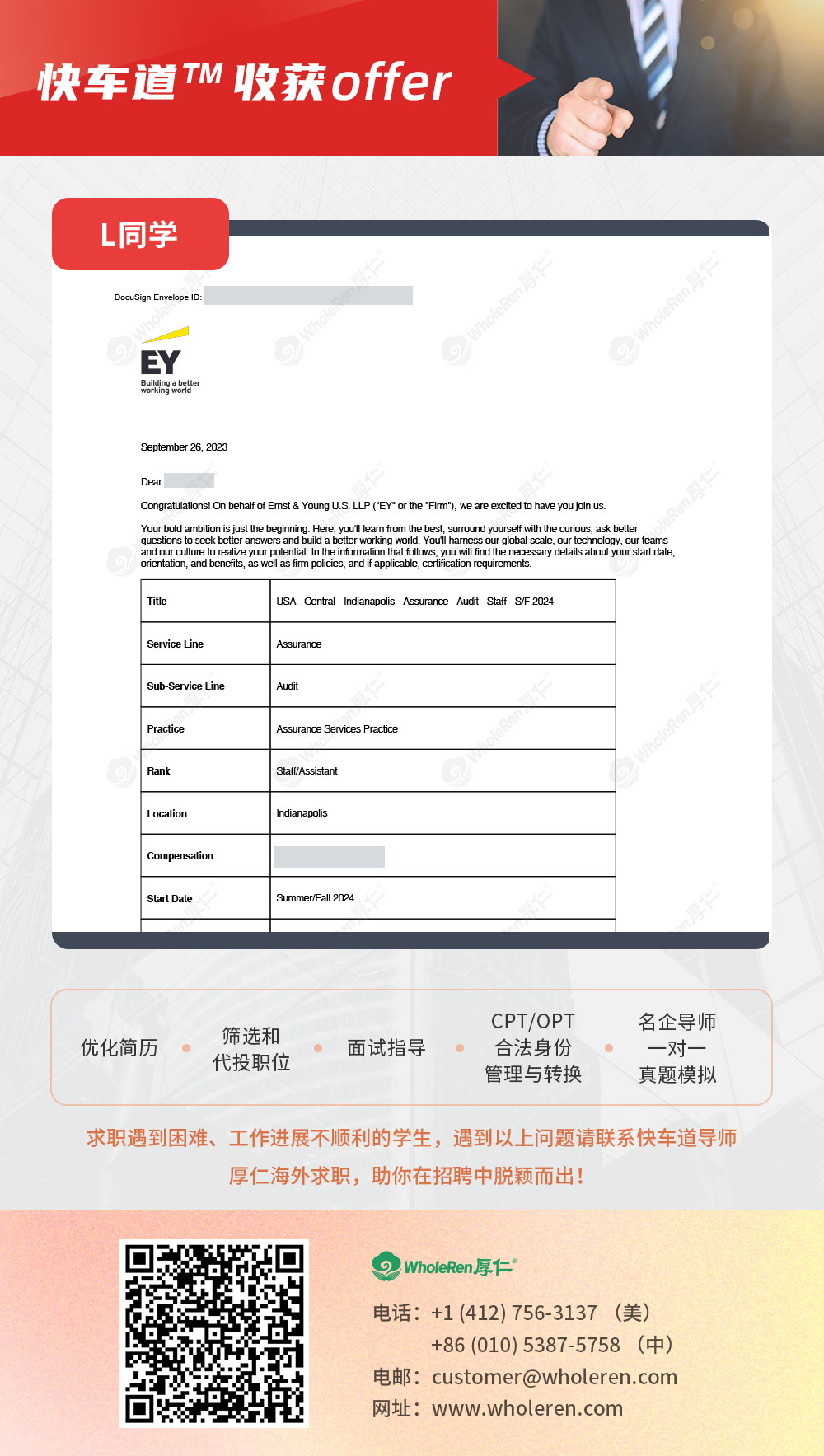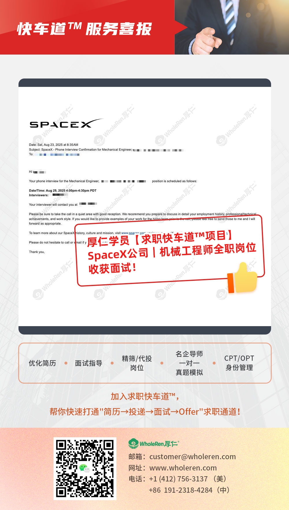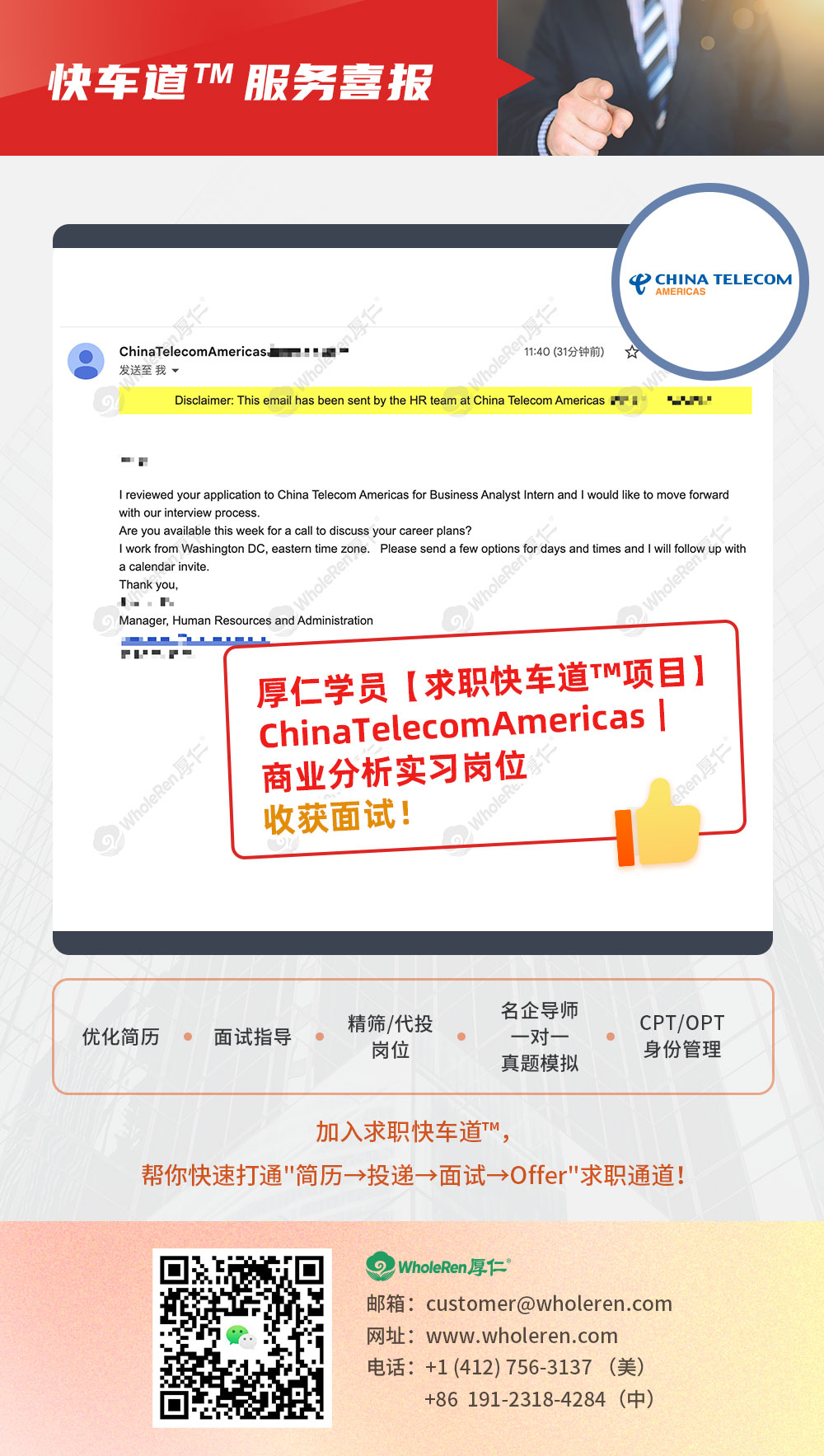 W同学在秋招的时候自己投递了很多岗位,但是迟迟都没有任何回应。在秋招快结束前W同学找到厚仁,选择了快车道™项目!厚仁求职导师在短时间内快速带领学生完成简历打磨,随后立刻开展了精准投递工作,在感恩节前夕收到公司面试邀请!厚仁导师对W同学进行多次面试辅导,经历过三轮面试后,终于收到公司的offer!