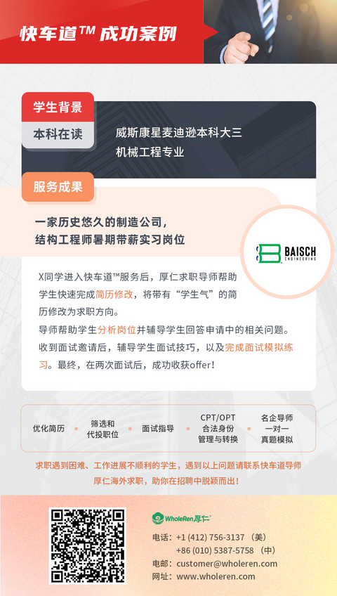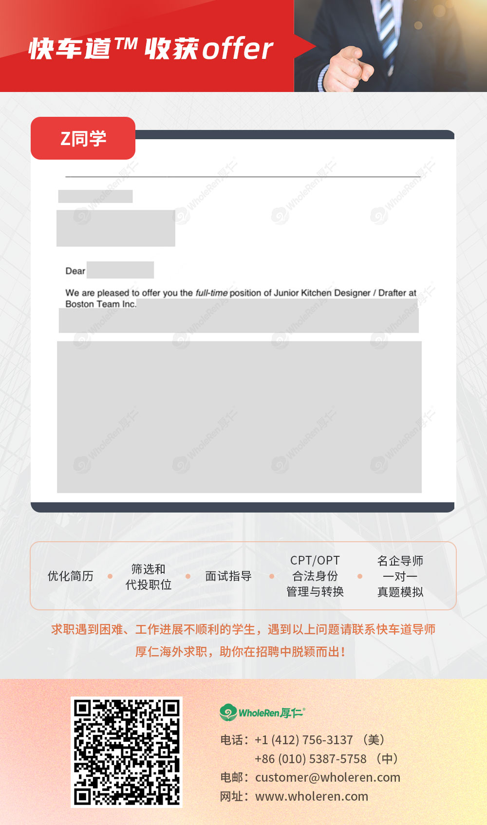Z同学在即将毕业的时候进入快车道™服务,时间很紧迫。厚仁导师针对申请不同岗位帮助Z同学完成两版简历打磨并投递。在厚仁导师的安排下Z同学积极参加了外籍导师的行为面试问题训练。最终Z同学通过面试,拿到了波士顿的一家设计公司全职offer。