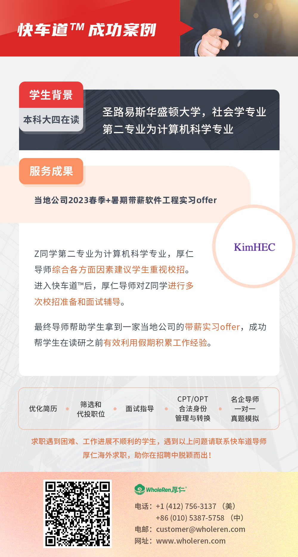 Z同学第二专业为计算机科学专业,厚仁导师综合各方面因素建议学生重视校招。进入快车道™后,厚仁导师对Z同学进行多次校招准备和面试辅导。最终导师帮助学生拿到一家当地公司的带薪实习offer,成功帮学生在读研之前有效利用假期积累工作经验。