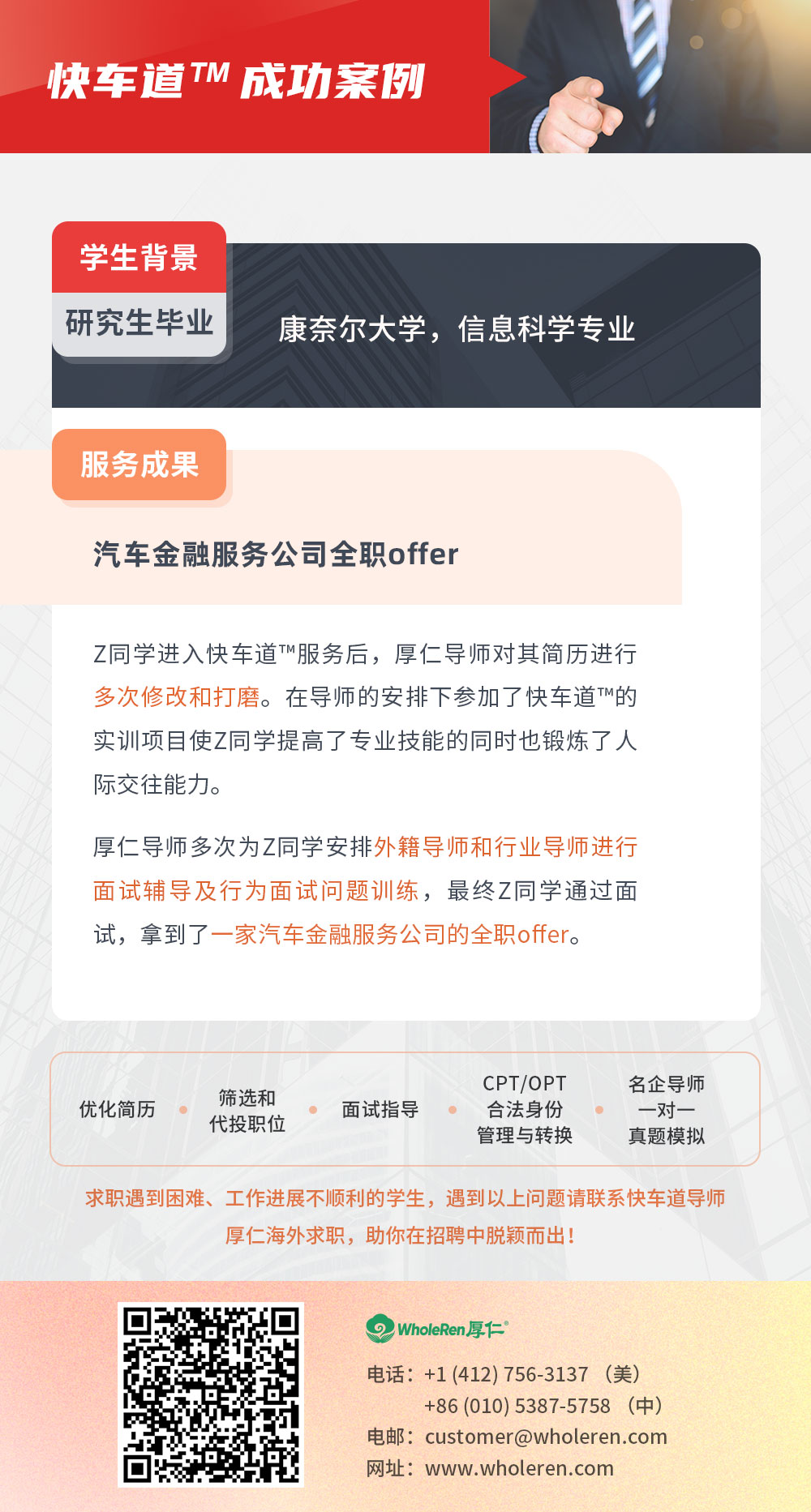 Z同学进入快车道™服务后,厚仁导师对其简历进行多次修改和打磨。在导师的安排下参加了快车道™的实训项目使Z同学提高了专业技能的同时也锻炼了人际交往能力。厚仁导师多次为Z同学安排外籍导师和行业导师进行面试辅导及行为面试问题训练,最终Z同学通过面试,拿到了一家汽车金融服务公司的全职offer。