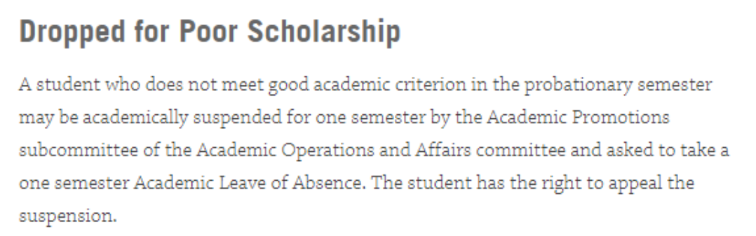 如果学生因为学术成绩差而被停学或者直接开除,学生有申诉的权利。在收到处罚决定的10个工作日内,学生可以向所在院系的Dean提出书面申诉。申诉请求中,除了要阐明申诉的原因和导致学术成绩不达标的原因外,还应当对未来的学习计划做出详细的解释。如果学生的申诉请求被批准,学生可以继续以probation的状态留校学习。