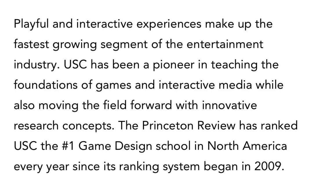 自2009年开始排名以来,《普林斯顿评论》每年都将南加州大学的游戏设计专业列为北美第一,是游戏圈绝对的霸主。