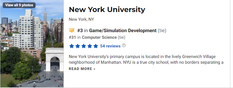 通过榜单我们可以看到,其实一些学校在游戏设计上的排名和在计算机科学专业上的排名还是有很大区别的,例如,在游戏设计专业上能排进前5的南加州大学、纽约大学、犹他大学,在计算机科学专业上的排名乍一看也并不是很高,分别为23、31、54。