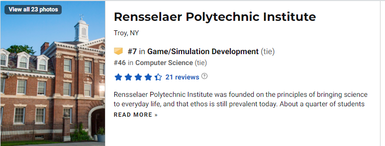 伦斯勒理工学院本科开设游戏与虚拟仿真模拟专业,学术目标是培养学生的构建、分析以及具体操作能力,比如:虚拟交互、社会互动、用基础的数学、物理、生物以及社会学知识构建游戏。