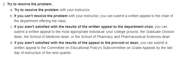 学生在与任课教师沟通无效后,可以向课程所在系的系主任提出成绩申诉。申诉流程与学术惩罚流程基本一致。如果学生对申诉结果不满意,可以依次向学院的院长和Educational Policy’s Subcommittee提出进一步的申诉请求。在提出申诉后,学生应当准备相应的支持性材料,包括但不限于个人陈述,证据,事情详细的经过等。